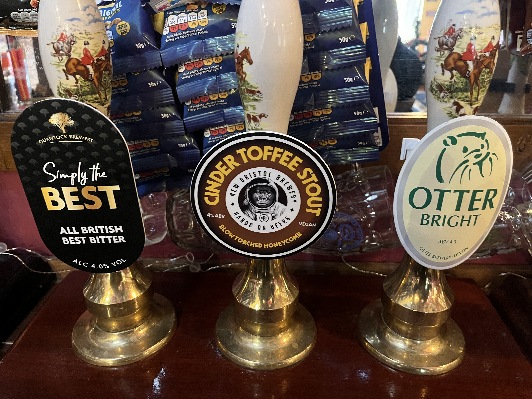 We have some great cask ales for you this week. We start with Simply the Best from Quantock Brewery, Cinder Toffee Stout from New Bristol Brewery and Otter Bright from Otter Brewery. Sam's Cider and ciders from Sandford Orchards and Green Man Cider, based in Landkey, are available, along with a range of wines, soft drinks and others. Something for everyone we hope.