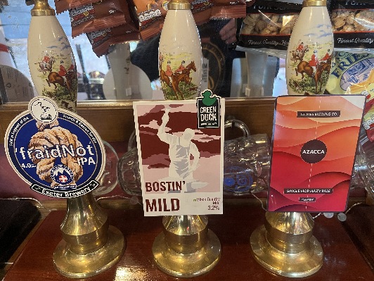 We have some great cask ales for you this week. We start with our beer of the month 'fraidNot from Exeter Brewery, Dodger from Twisted Oak Brewery in Somerset and Attermire Pale from Settle Brewery in Yorkshire. Sam's Cider and ciders from Sandford Orchards and Green Man Cider, based in Landkey, are available, along with a range of wines, soft drinks and others. Something for everyone we hope.